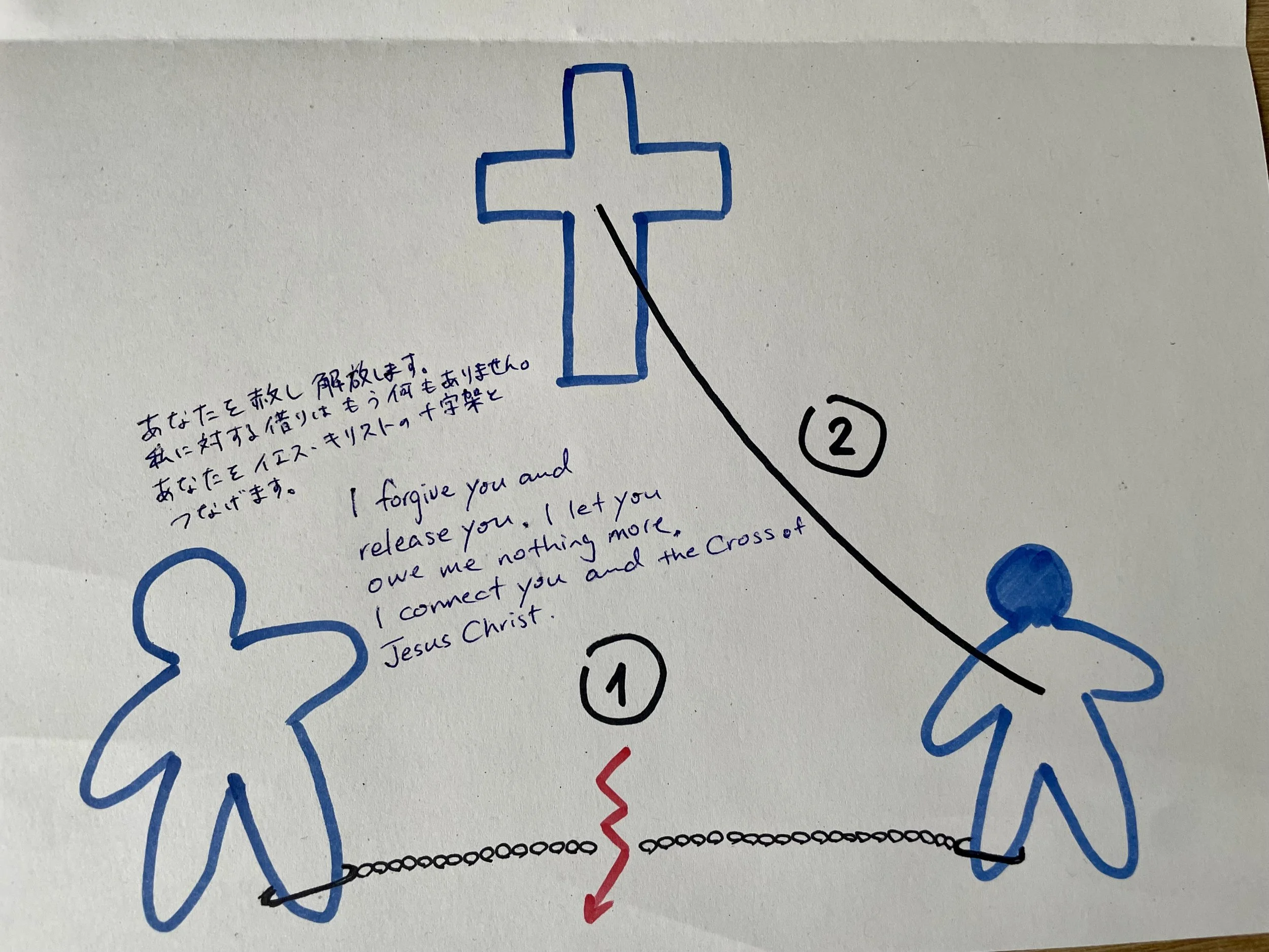 In this sense, this debriefing experience was groundbreaking for me. I learned that forgiveness also involves releasing the ‘perpetrator’ and connecting him/her to the cross of Jesus. Even if you forgive someone, if you do not release them, you remain bound to that person in your thoughts by invisible shackles (See the drawing). But if, because of the cross, you continue to forgive, continue to release, and continue to connect that person to Jesus’ cross (entrusting that person to Him), then God takes responsibility—and you become free. (Romans 12:19–20, John 8:31–32)